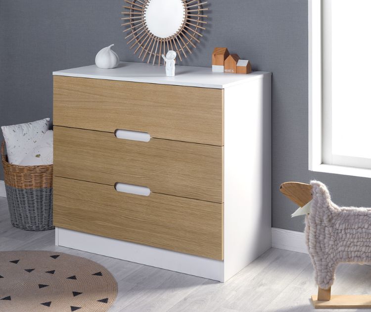 Um das Kinderbett zu ergänzen, können Sie Aufbewahrungsmöbel im Babyzimmer hinzufügen. Die Kommode ist eine ausgezeichnete Wahl, um alle kleinen Babysachen zu organisieren. Einige Modelle können mit einem abnehmbaren Wickelaufsatz ergänzt werden, um daraus einen Wickeltisch mit Stauraum für die benötigte Zeit zu machen.