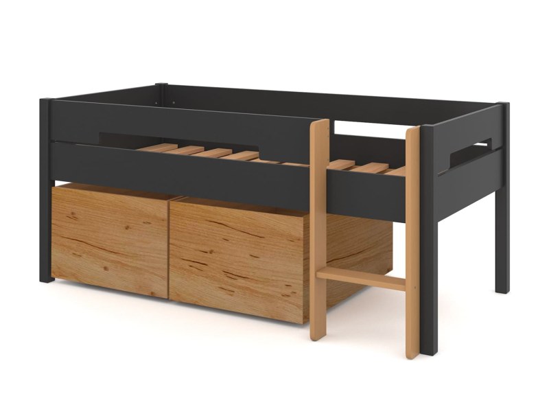 With its large storage units on wheels, your child can easily store their toys, books, and everything they need. The Milo mid-height bed's storage units fit under the bed to help you save space.