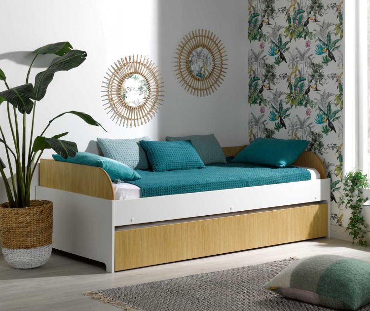 Por lo tanto, si la habitación de tu adolescente no te parece muy espaciosa, optar por una cama alta como nuestra cama alta Landes caqui y madera será una manera muy ingeniosa de amueblar la habitación.