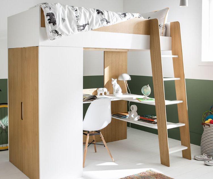 Más que en una habitación de adolescente, la cama alta puede instalarse en una habitación infantil. Sin embargo, hay que tener en cuenta que este tipo de cama solo puede utilizarse a partir de los 6 años. Antes de esa edad, el uso de la escalera para alcanzar el colchón representa un riesgo demasiado alto de caída. Si desea optar por este tipo de cama antes de la adolescencia, deberá asegurarse de que su hijo tenga al menos 6 años para poder utilizarla.