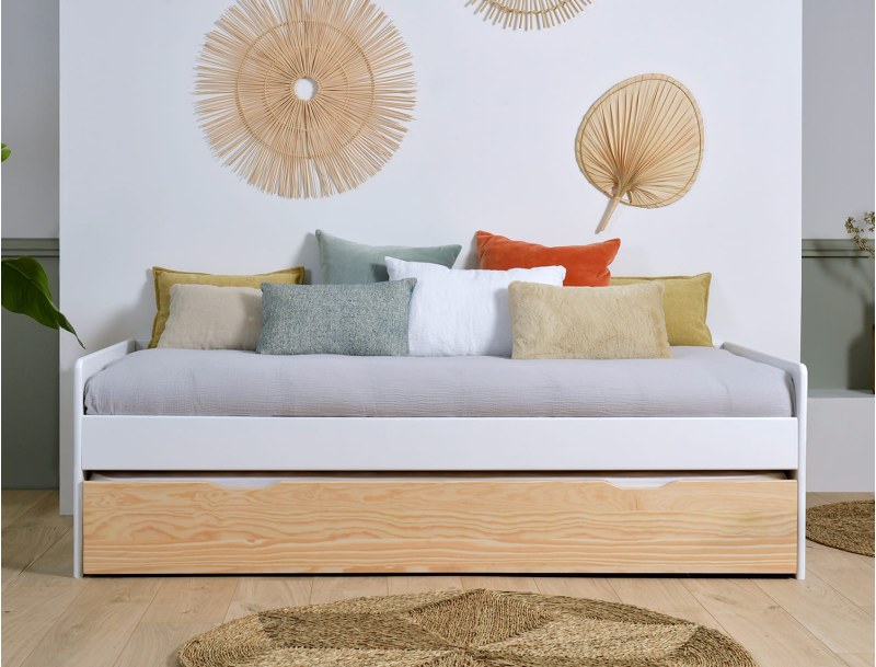 Nuestra cama nido blanca y de madera Landes está compuesta por dos camas de 90x190cm cada una. El somier principal se presenta en forma de sofá bajo el cual se esconde la segunda cama. Al tirar del cajón, aparece la cama adicional para colocarse al nivel del sofá. Por lo tanto, podrá hacer dormir a 2 niños o incluso 2 adultos en la misma habitación.