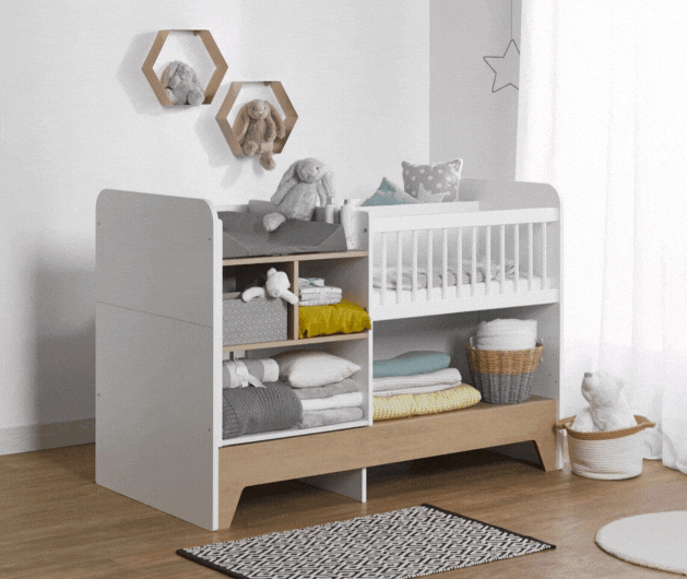 Notre lit bébé évolutif Octave blanc et chêne est par exemple un excellent choix. Il dispose de petites étagères en bout de lit dans sa version lit à barreaux. Après transformation, il devient un joli petit lit pour enfant.