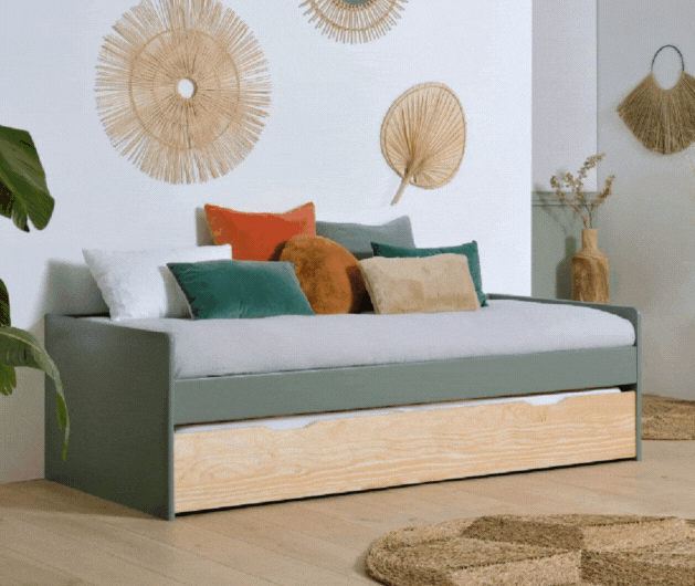 Le bois reste la matière la plus adéquate pour ce type de mobilier, car elle permet de choisir un meuble qui sera durable dans le temps et robuste. Si vous en avez la possibilité, choisissez un lit gigogne fabriqué avec du bois disposant du label FSC ou PEFC pour vous assurer que le bois utilisé est issu de forêts gérées durablement. L’utilisation de panneaux de bois écologiques et de peinture sans solvant est aussi préférable, et d’autant plus dans une chambre d’enfant. C’est notamment le cas de notre lit banquette gigogne LANDES kaki. Par ailleurs, privilégier le made in France est aussi préférable pour la qualité du meuble et son empreinte écologique.