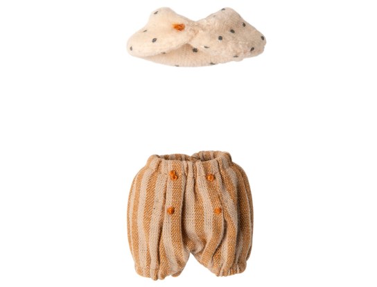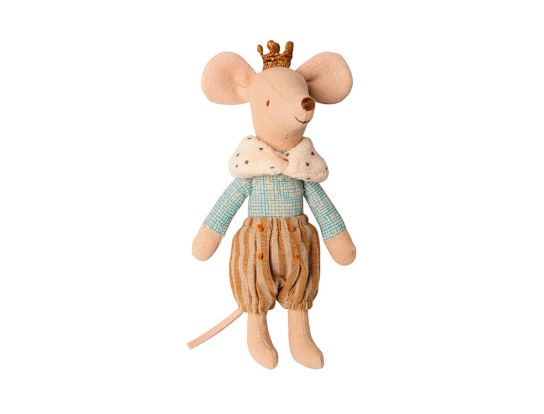 Molto elegante, l'abito del principe topolino è composto da un colletto d'ermellino, pantaloni a sbuffo e una corona dorata. Questo personaggio principesco è realizzato in tela di lino grezza con dettagli delicati. Le orecchie e la coda di questo giocattolo in tessuto sono realizzate in similpelle. Avventurati in un universo poetico per piccoli e grandi!