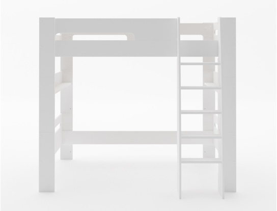 Il letto a soppalco London Bianco è dotato di una barriera di protezione e di una scala con gradini piatti posizionabile a destra o a sinistra a seconda della disposizione della camera.