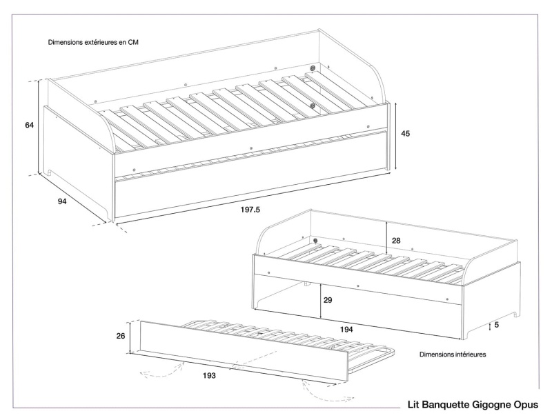 Il 1o vantaggio del letto divano estraibile consiste nell'offrire due veri letti per bambini, il principale dotato di una rete a doghe in Pino massiccio e l'altro letto estraibile situato sotto si presenta con una struttura metallica pieghevole molto solida e sicura.