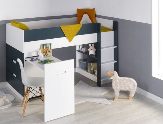 Il Bianco e il Blu notte valorizzano il design del letto a soppalco basso con scrivania e cassettiera Opus e rendono questo mobile adatto sia per le bambine che per i bambini, questo prodotto si abbinerà con qualsiasi altro mobile e decorazione.