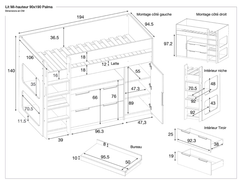 Infatti, due grandi cassetti sono posizionati sotto la scrivania scorrevole, permettendo al vostro bambino di riporre i suoi vestiti, i suoi giocattoli o le sue lenzuola. Le due nicchie del letto a soppalco, situate sul lato, sono abbastanza profonde da fungere da libreria o per esporre oggetti decorativi. Infine, dall'altro lato della scrivania si trova una porta che nasconde 3 ripiani dove il vostro bambino può riporre i suoi effetti personali.