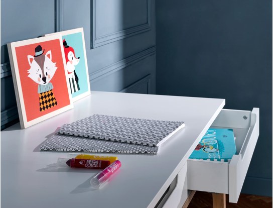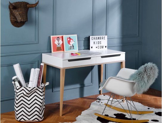 Uno spirito sia scandinavo che vintage. Questa scrivania per bambini con cassetto in legno chiaro e bianco offre uno stile sobrio e senza tempo, facile da integrare nella decorazione della camera di vostra figlia o di vostro figlio.