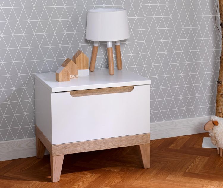 Als uw kinderbed van 90x190 geen kleine opbergruimte heeft bij het hoofdeinde, is het handig om een klein nachtkastje toe te voegen. U kunt kiezen voor een vrijstaand meubel als de ruimte het toelaat om boeken op te bergen, een bril neer te leggen voor het slapen gaan of een nachtlampje te plaatsen. In kleinere kamers kan een eenvoudige wandplank ook prima volstaan.