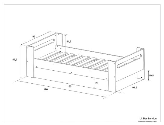 De London kinderbedden worden gemaakt in onze Sofamo-fabriek in Frankrijk, nabij La Rochelle. Om te voldoen aan de veiligheidsnormen, zijn al onze meubels gegarandeerd zodat uw kind veilig kan slapen terwijl we originele ontwerpen bieden. Uw London kinderbed wordt geleverd in dozen en u dient het bed zelf in elkaar te zetten volgens de montagehandleiding die bij het beslag wordt meegeleverd.
