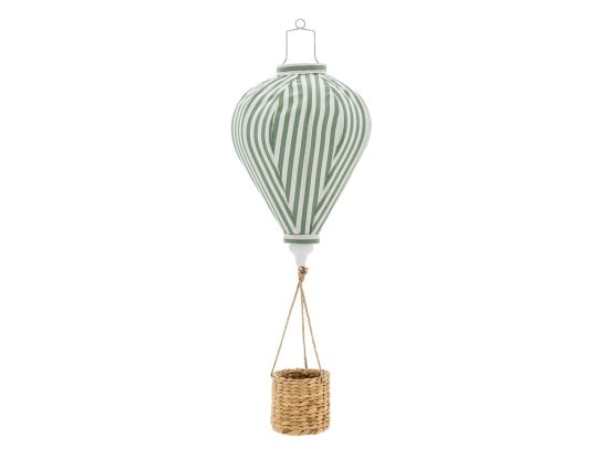 Breng poëzie en ontsnapping in de kamer van uw kind met de hangende groene Pomp Mobile luchtballon speelgoed van Bloomingville. Als een kruising tussen decoratief object en fantasiespeelgoed, vervoert deze luchtballon van groen-wit gestreepte stof kleine personages en knuffels in zijn mand van natuurlijke vezels. Opgehangen aan het plafond lijkt het te zweven in de lucht, wat een zachte en sprookjesachtige sfeer creëert die zowel klein als groot verwondert.